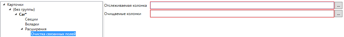 В поле “Очищаемые колонки” указывается набор колонок, которые будут очищены при очистке “Отслеживаемой колонки”. Это могут быть поля любой принадлежащей карточке строковой секции, а так же поля табличной секции карточки.