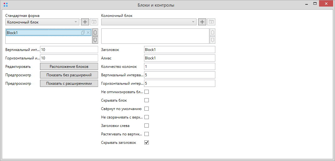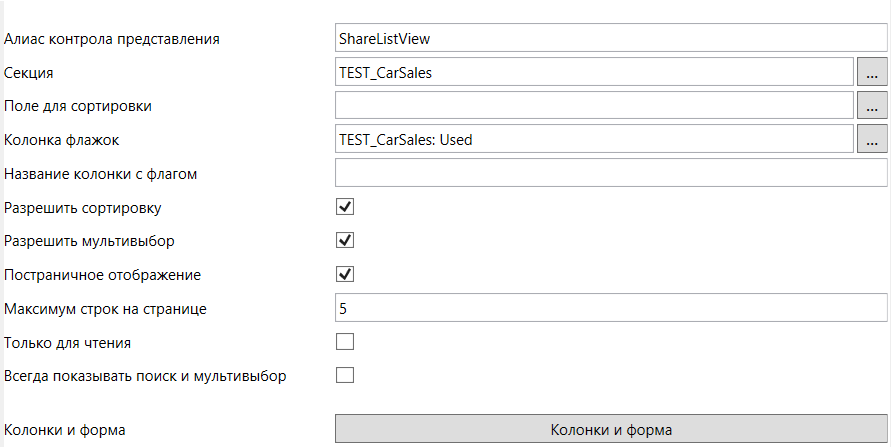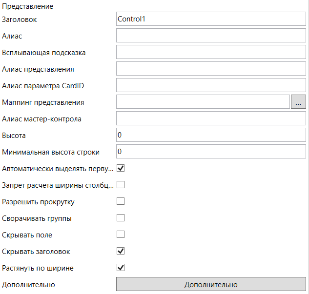 Для корректной работы расширения необходимо добавить в карточку элемент управления “Представление” с уникальным алиасом. Флажок “Автоматически выделять первую строку” должен быть выключен.