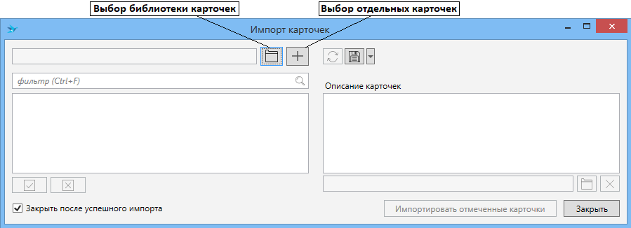 В открывшемся окне выбрать или библиотеку карточек .cardlib, или файлы карточек .jcard/*.card+: