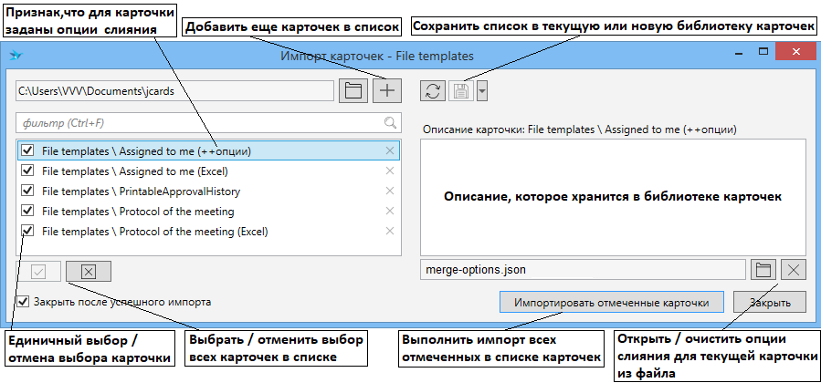 merge-options.jsonв поддиректории относительно местонахождения файла карточки, наименование поддиректории должно быть именем файла карточки без расширения (например, если имя файла карточкиCardForImport.jcard, то файлmerge-options.jsonдолжен находиться в поддиректории с наименованиемCardForImport).