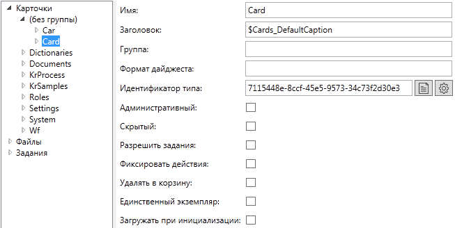 В данном разделе можно создавать, редактировать и просматривать типы карточек, типы карточек заданий и типы карточек файлов: