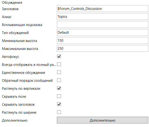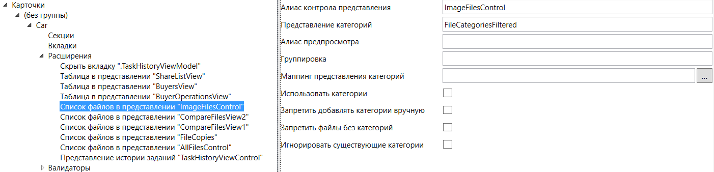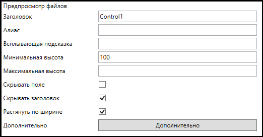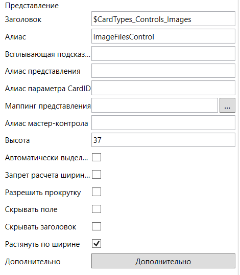 Для корректной работы расширения типа необходимо задать в строке “Алиас контрола представления” уникальный алиас, указанный при создании контрола “Представление”. Настройки этого расширения аналогичны настройкам элемента управления “Список файлов”, где доступно описание этих настроек.