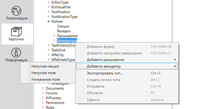 Добавить валидатор для типа можно из контекстного меню, вызываемого кликом правой кнопки мыши на типе карточки, пункт “Добавить валидатор”:
