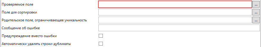 Проверяемое поле - поле, которое будет проверяться на уникальность. Может быть в строковой секции – тогда проверяется уникальность в рамках карточки в базе данных. Если в коллекционной секции, то в рамках текущей карточки.