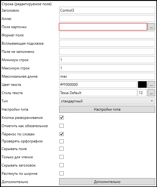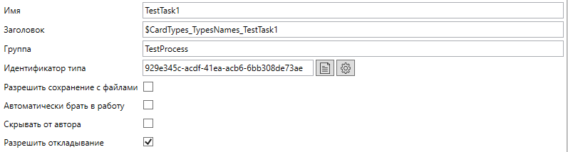 Тип задания дополнительно (помимо стандартных, описанных в разделе создания типа карточки) имеет следующие настройки: