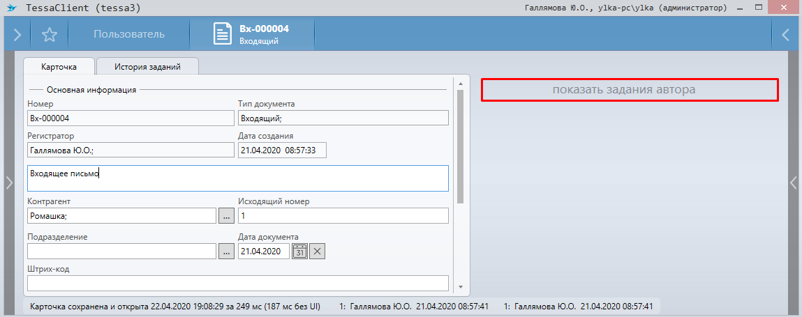 Нажав на ссылку, откроется область с заданием, где можно посмотреть информацию по заданию, или выполнить действия, доступные автору (например, отозвать задание или изменить параметры).