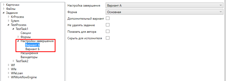 Если при нажатии на кнопку настройки завершения не надо пользователю отображать какие-то дополнительные поля, а надо сразу выполнять действие с заданием, то выбирается форма “Основная”.