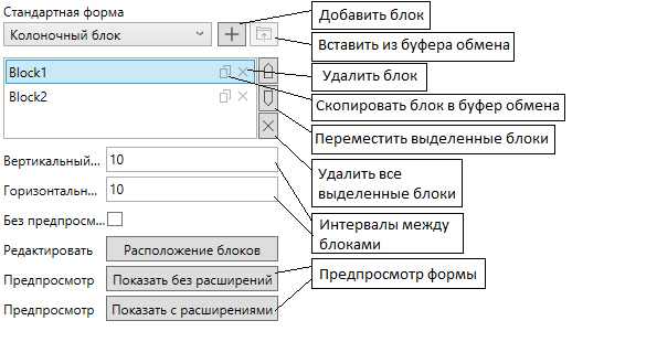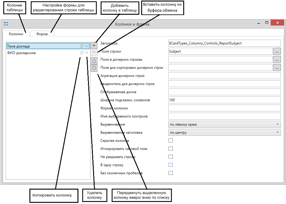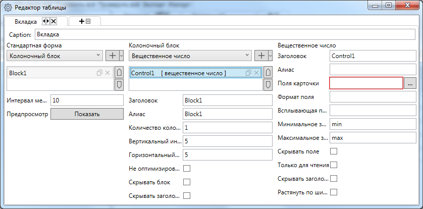 Элементы карточки (вкладки, блоки, контролы, колонки) можно копировать в рамках одной карточки, а так же между двумя разными карточками. Для копирования и вставки блоков, контролов и колонок можно использовать как команды [Ctrl]+[C] и [Ctrl]+[V], так и специальные кнопки в интерфейсе. Копирование и вставка вкладок осуществляется только при помощи контекстных меню.