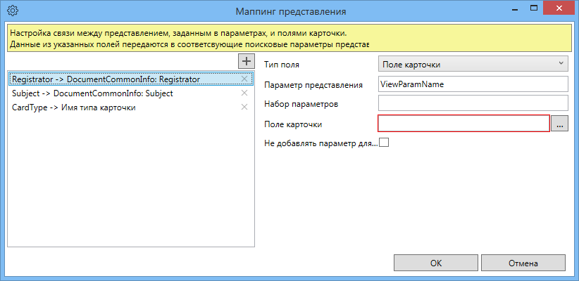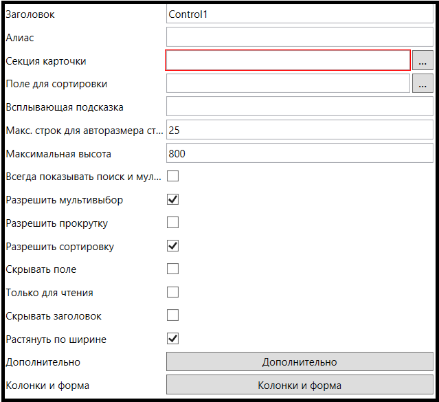 Для корректной работы расширения необходимо добавить в карточку элемент управления “Представление” с уникальным алиасом. В настройке “Алиас контрола представления” должен быть введен уникальный алиас, указанный при создании контрола “Представление”.