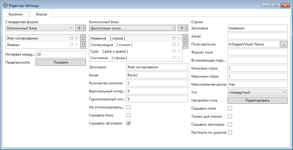 Доступна возможность отображать флаг в первой колонке таблицы, который привязан к полю строки типа Boolean в настройке Колонка флажок.