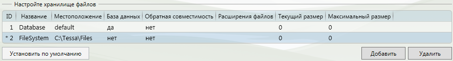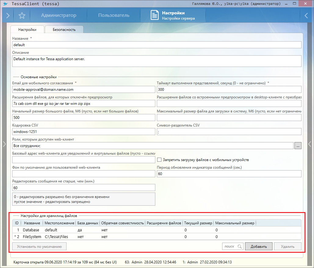 Для выполнения миграции предварительно в карточке настроек сервера (TessaClient, запущенный от имени Администратора, правая панель → Настройки → Настройки сервера) надо добавить новое хранилище данных и сделать его по умолчанию. Более подробно см. в разделе Настройки сервера.