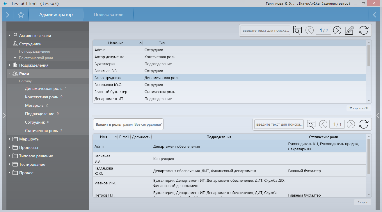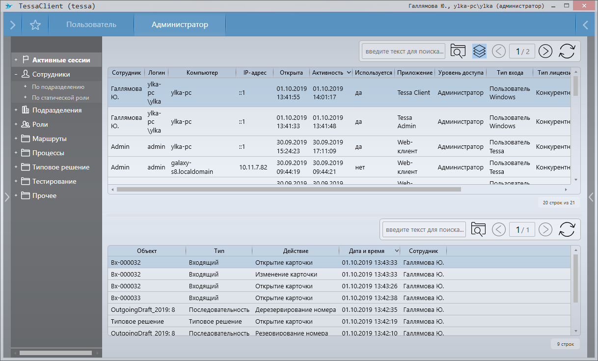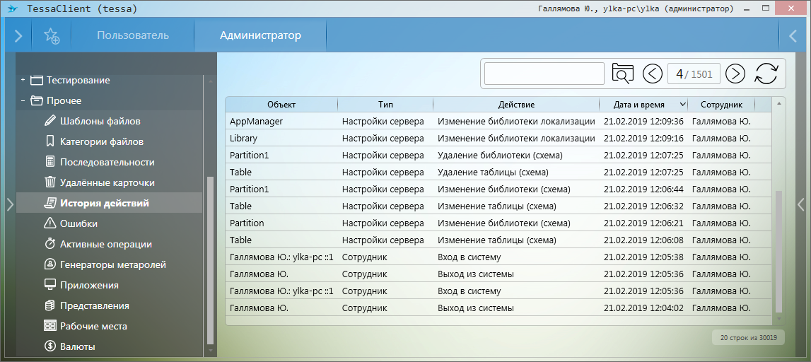 Просмотр истории действий в Tessa доступен только для администраторов системы (т.е. уровень доступа сотрудника - “Администратор”, см. Создание карточки сотрудника).