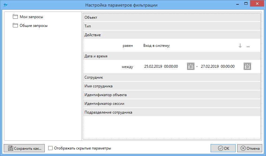 По умолчанию записи отсортированы по дате/времени события. В данном представлении можно выполнить поиск по параметрам (нажав на кнопку с изображением лупы), например - просмотр информации о входе в систему любых сотрудников за конкретную дату: