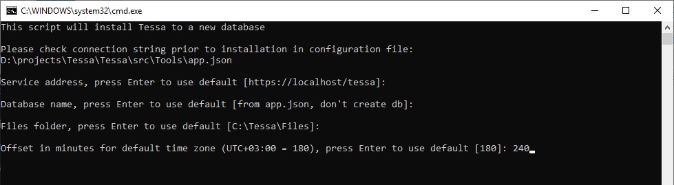 Далее будет предложено указать имя целевой базы данных, или нажмите клавишу [Enter], чтобы использовать базу, указанную в конфигурационном файле утилиты tadmin. Указание имени базы работает аналогично скрипту установки Setup.bat: если имя не указать, то оно берётся из конфигурационного файла и база НЕ создаётся (т.е. пустая база должна быть предварительно создана на нужном сервере), а если указать, то база будет создана самим скриптом (со всеми настройками по умолчанию).