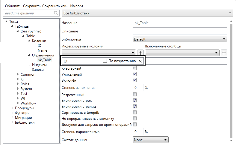 Чтобы задать ключевое поле, в разделе Индексируемые колонки из выпадающего списка выберите нужное поле и далее нажмите на кнопку +.