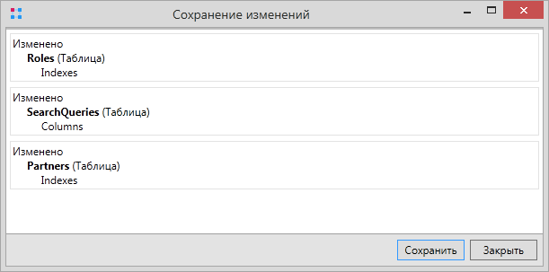 После того, как настройка таблицы будет завершена, необходимо её сохранить. Для сохранения нажмите [Ctrl]+[S], затем в появившемся диалоговом окне со списком изменений нажмите “Сохранить”: