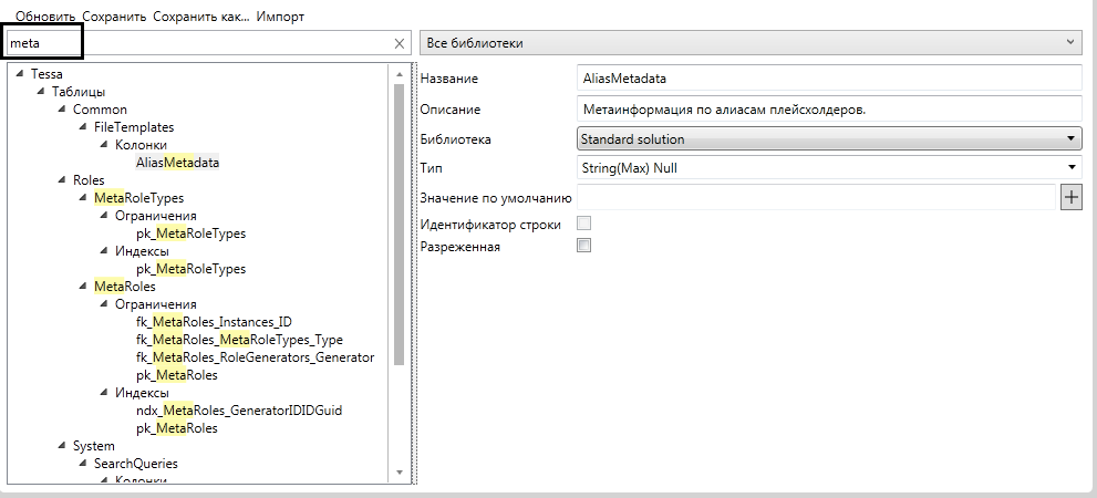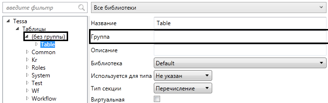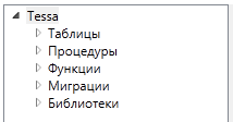 Каждая из этих ветвей содержит объекты соответствующего типа (таблицы/ процедуры/ функции/ миграции/ библиотеки), разделенные на группы (группа задается в свойстве “Группа” самого объекта).