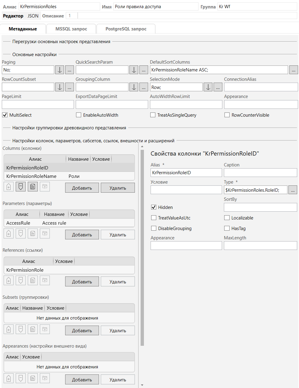 | Метаданные | Редактор свойств представления. |