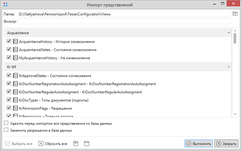 При выборе опции “Заменить разрешения в базе данных” у обновляемых представлений будут очищены указанные в представлении роли и указаны роли, содержащиеся в импортируемом представлении.