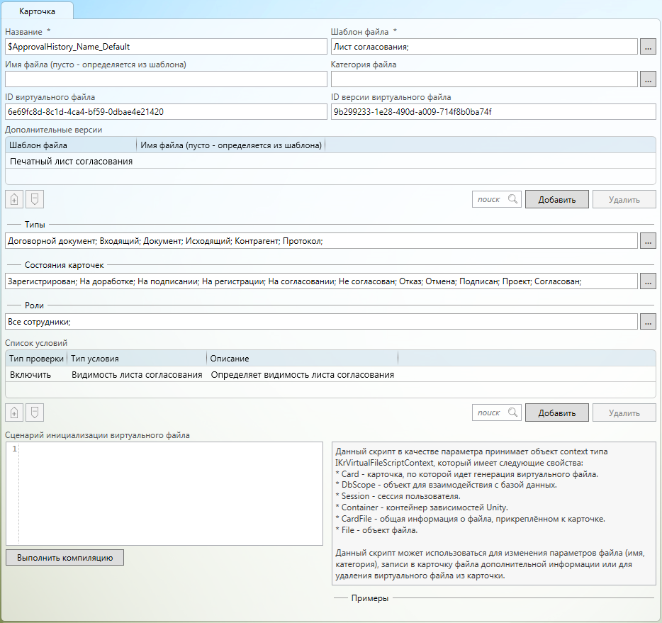 Сценарий инициализации виртуального файла - сценарий, который вызывается после добавления виртуального файла в загружаемую пользователем карточку. Данный скрипт может использоваться для изменения параметров файла (имя, категория), записи в карточку файла дополнительной информации или для удаления виртуального файла или его версии из карточки.