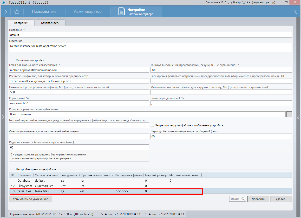 В настройках сервера (Tessa Client → правая панель системы → Настройки → Настройки сервера) добавим хранилище файлов. Указываем Местоположение -