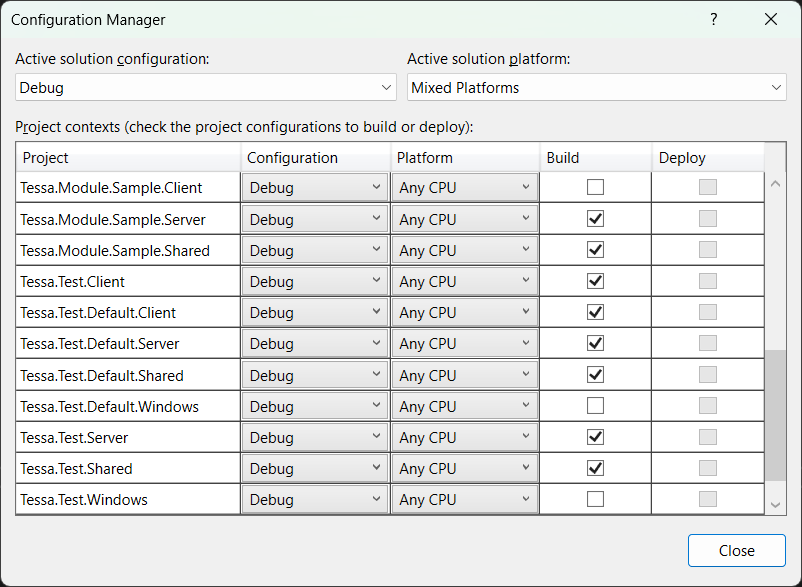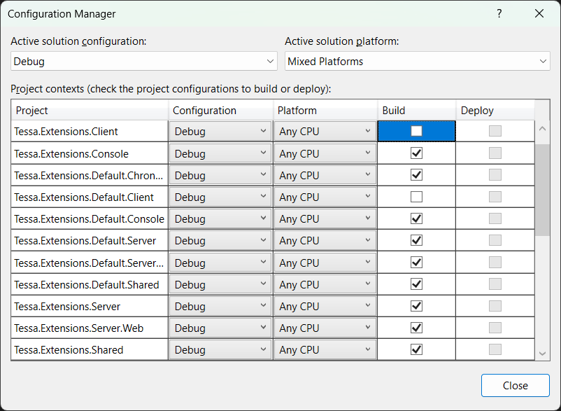 DebugиRelease(в выпадающем списке сверху) снимите флаг в колонкеBuildдля следующих проектов:Tessa.Extensions.ClientTessa.Extensions.Default.ClientTessa.Module.Sample.ClientTessa.Test.Default.WindowsTessa.Test.Windows