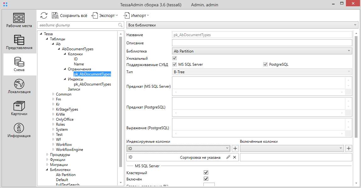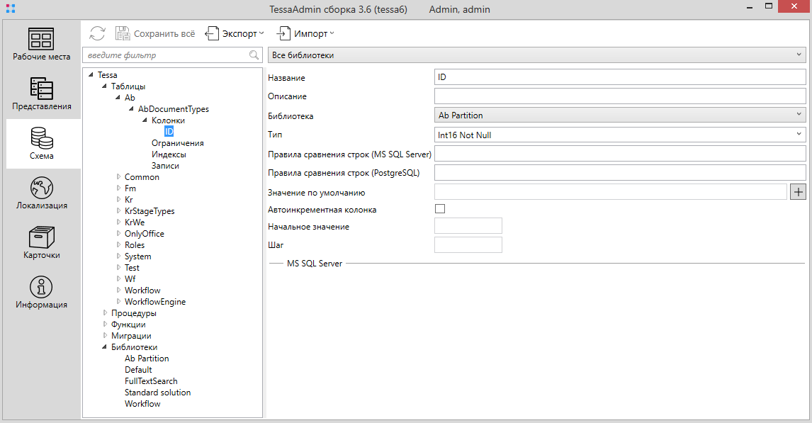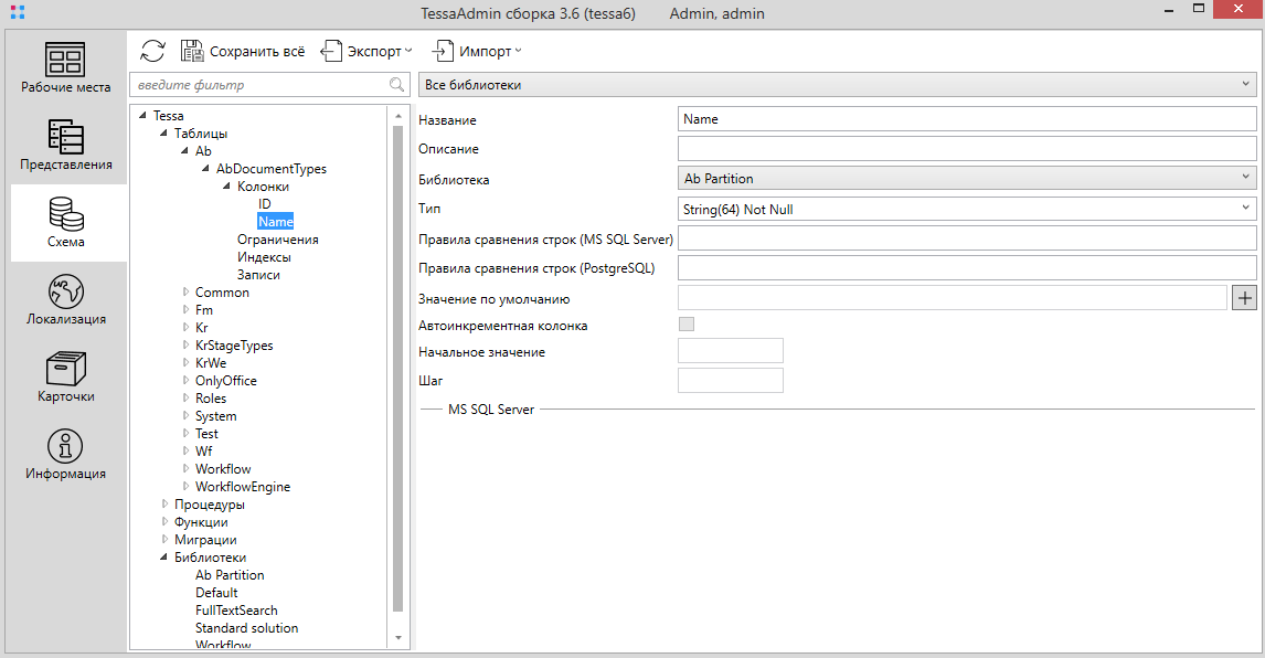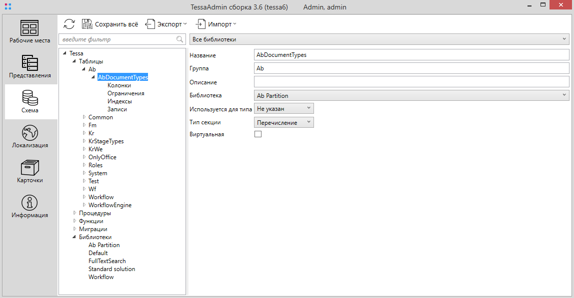 Схема данных настраивается на вкладке Схема на панели навигации в левой части окна TessaAdmin. В дереве под узлом Таблицы расположены группы таблиц, а внутри – собственно таблицы с их колонками.