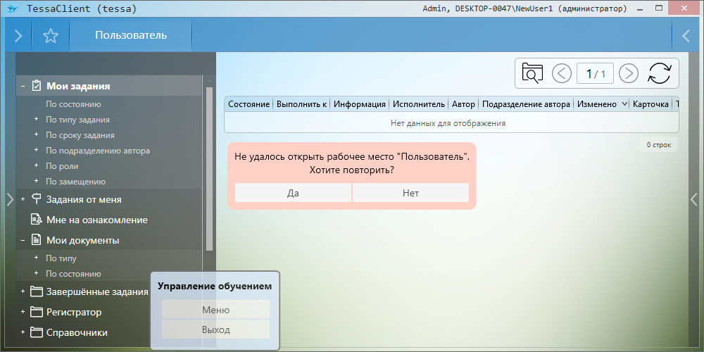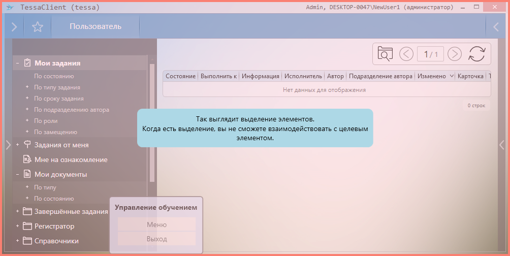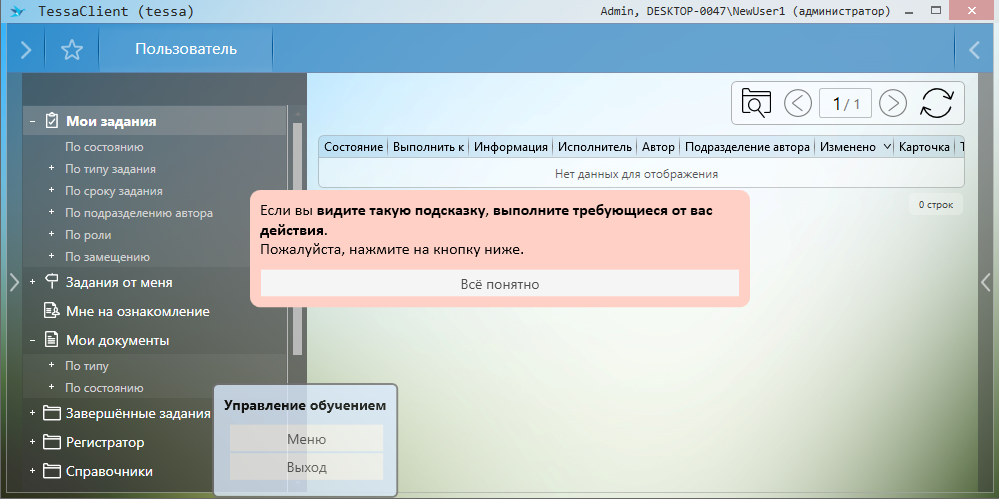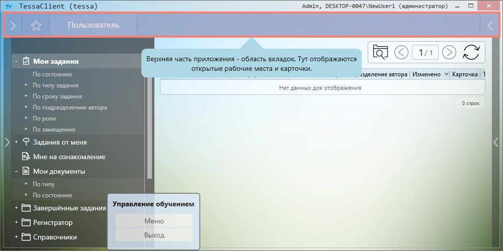 Сценарий обучения работы с окном TessaClient |