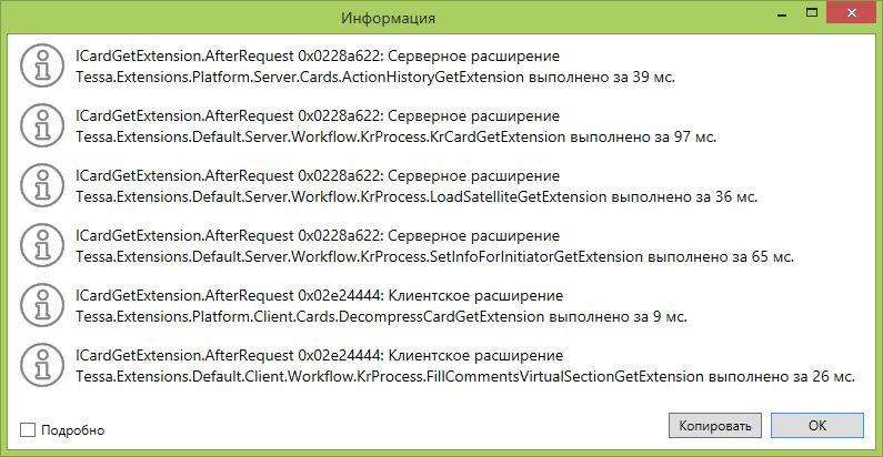Profile – включена трассировка всех расширений с подсчётом времени выполнения для каждого расширения, но для вывода пользователю (в объект context.ValidationResult) сохраняются лишь записи для тех расширений, которые выполнялись бы достаточно большое время (не меньше 5 мс). Если в таком режиме при выполнении действий с карточками не будет выведено сообщений, то каждое расширение было выполнено менее, чем за 5 миллисекунд.