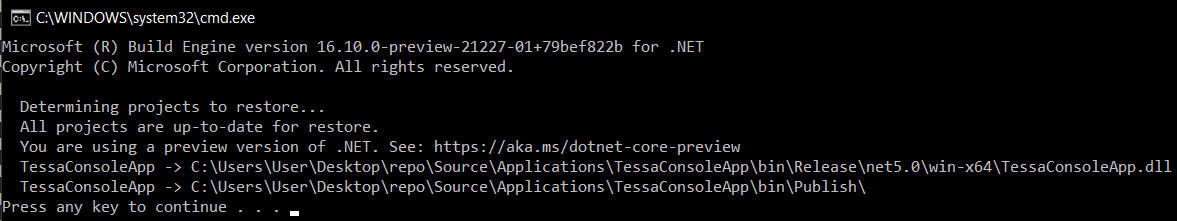 В папке bin\Publish будет расположен собранный проект, который можно скопировать в любую папку и использовать для соответствующей ОС (64-битной Windows или 64-битной Linux). Никаких требований к компьютерам, на которых будет запускаться консольная утилита, не предъявляется, т.е. устанавливать .NET Framework или .NET 5.0 не требуется. Поддерживаемые операционные системы определяются используемой платформой .NET, например, для версии .NET 5.0 требования перечислены в документации Microsoft. Если вы используете API TESSA, то обратитесь к руководству по установке и руководству по установке на Linux для системы TESSA.