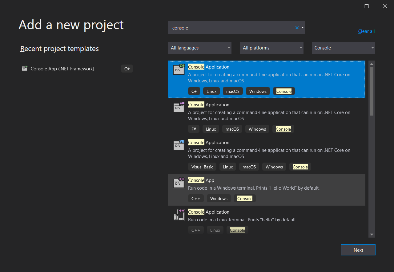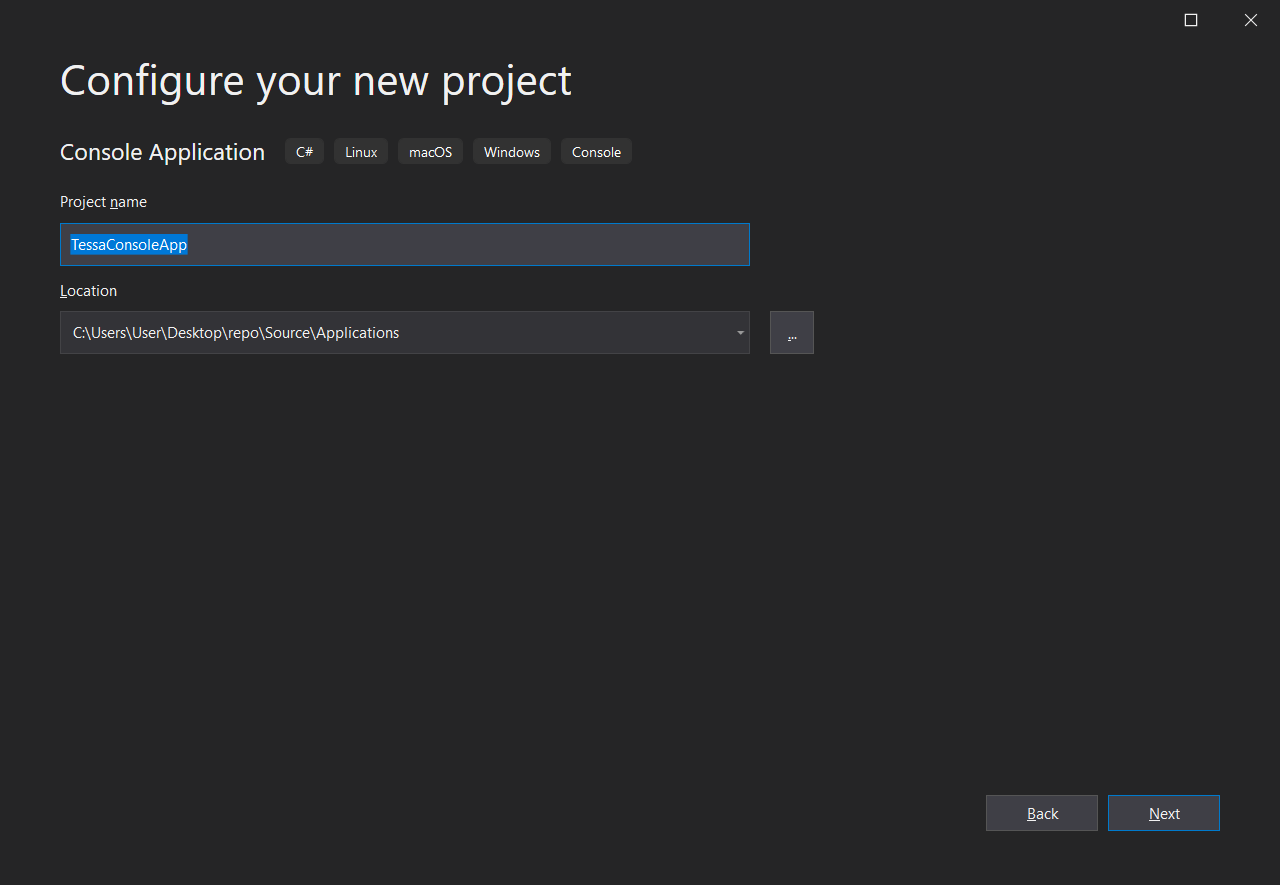 Откройте Visual Studio проектного решения Source\Tessa.Extensions.sln. Создайте папку Applications в контекстном меню Solution Explorer. Далее создайте проект Console Application через контекстное меню в папке, который поместите в подпапку Source\Applications, указав путь в поле Location.