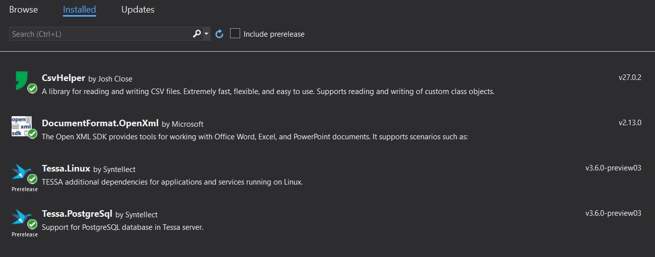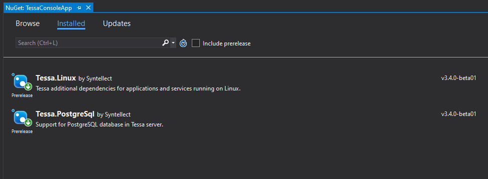 Перейдите на вкладку Browse и последовательно установите пакеты Tessa.Linux и Tessa.PostgreSql, выбрав версию пакета, соответствующую версии вашей сборки TESSA. Например, для версии сборки TESSA 3.6.0 с патчем 1 укажите версию пакетов также 3.6.0.1. Не обновляйте пакеты до более новых версий до того, как будет обновлена инсталляция всей платформы (вместе с конфигурацией, базой данных и расширениями).