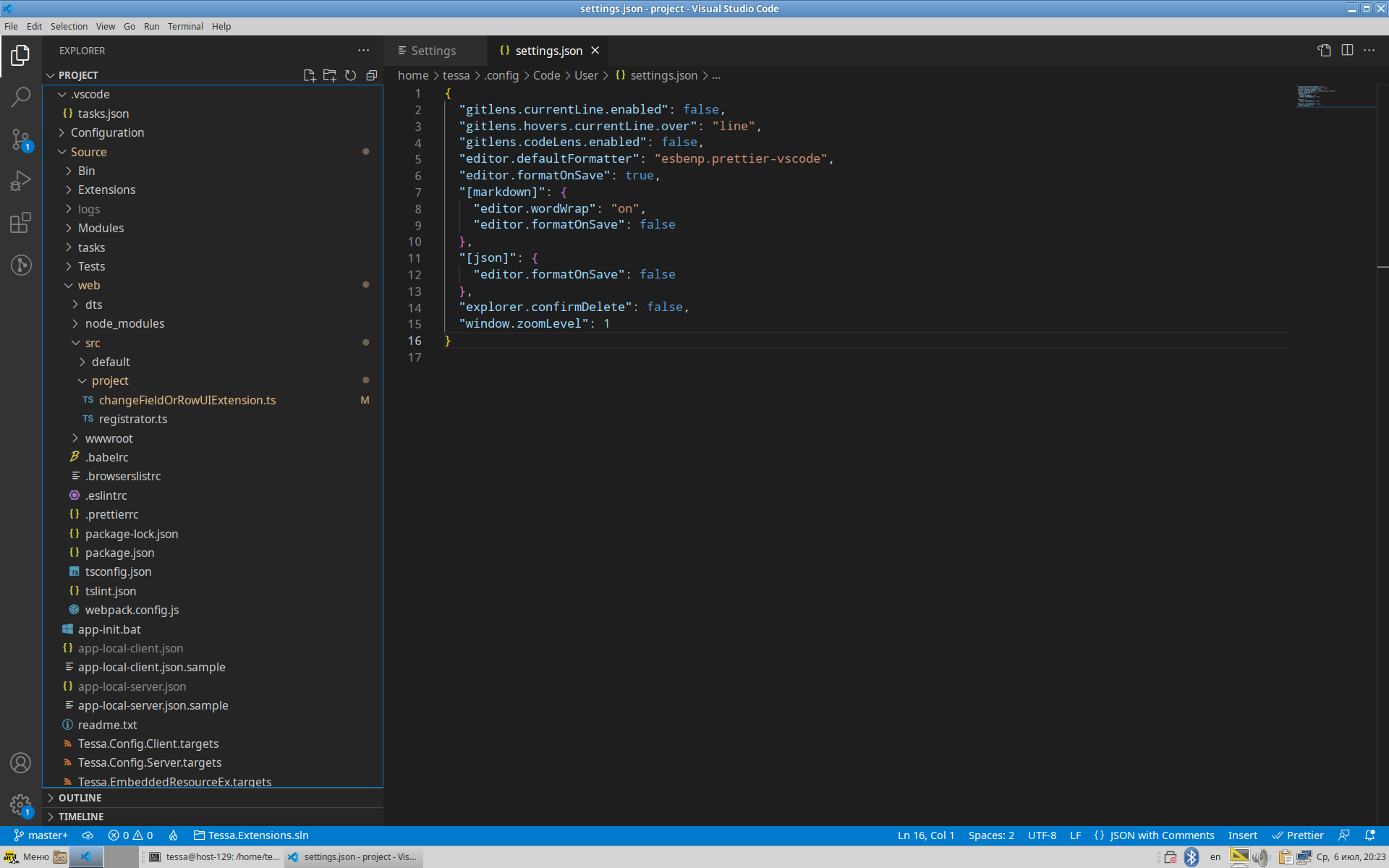 Prettier(после указания перезапустите приложение):{ "gitlens.currentLine.enabled": false, "gitlens.hovers.currentLine.over": "line", "gitlens.codeLens.enabled": false, "editor.defaultFormatter": "esbenp.prettier-vscode", "editor.formatOnSave": true, "[markdown]": { "editor.wordWrap": "on", "editor.formatOnSave": false }, "[json]": { "editor.formatOnSave": false } }