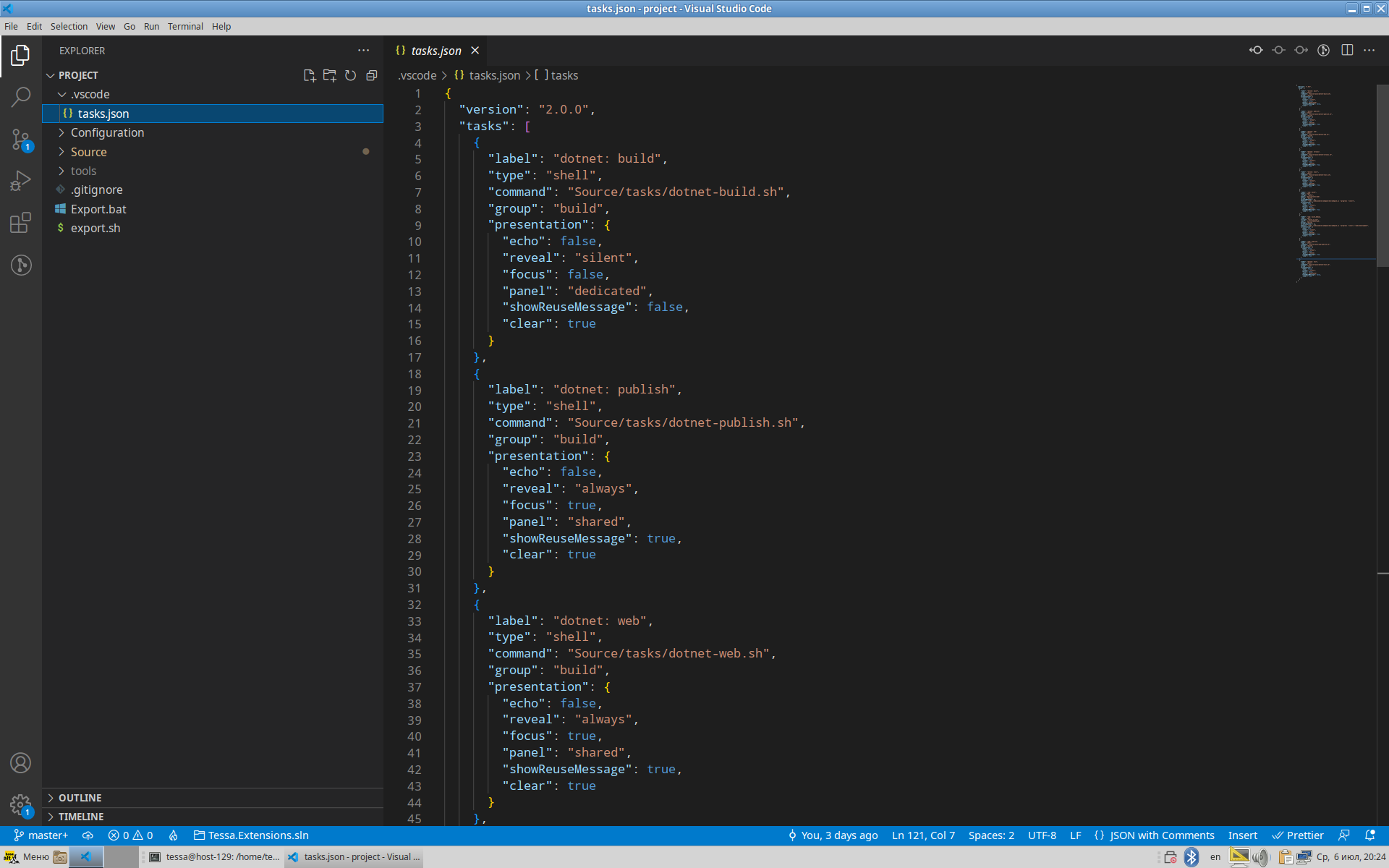 Таски в VS Code определяются в файле ~/project/.vscode/tasks.json. Они позволяют выполнять нажатием нескольких кнопок действия по сборке решения с обновлением локально развёрнутых сервисов, а также выполнять тесты.