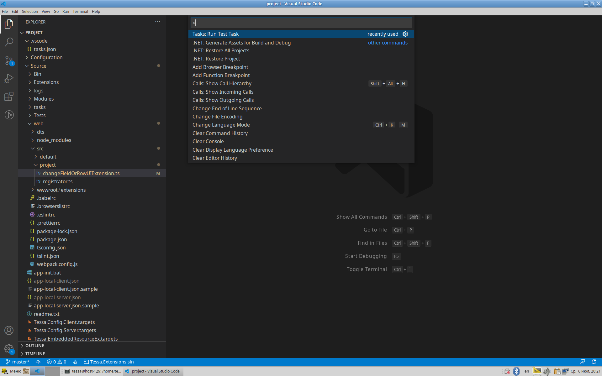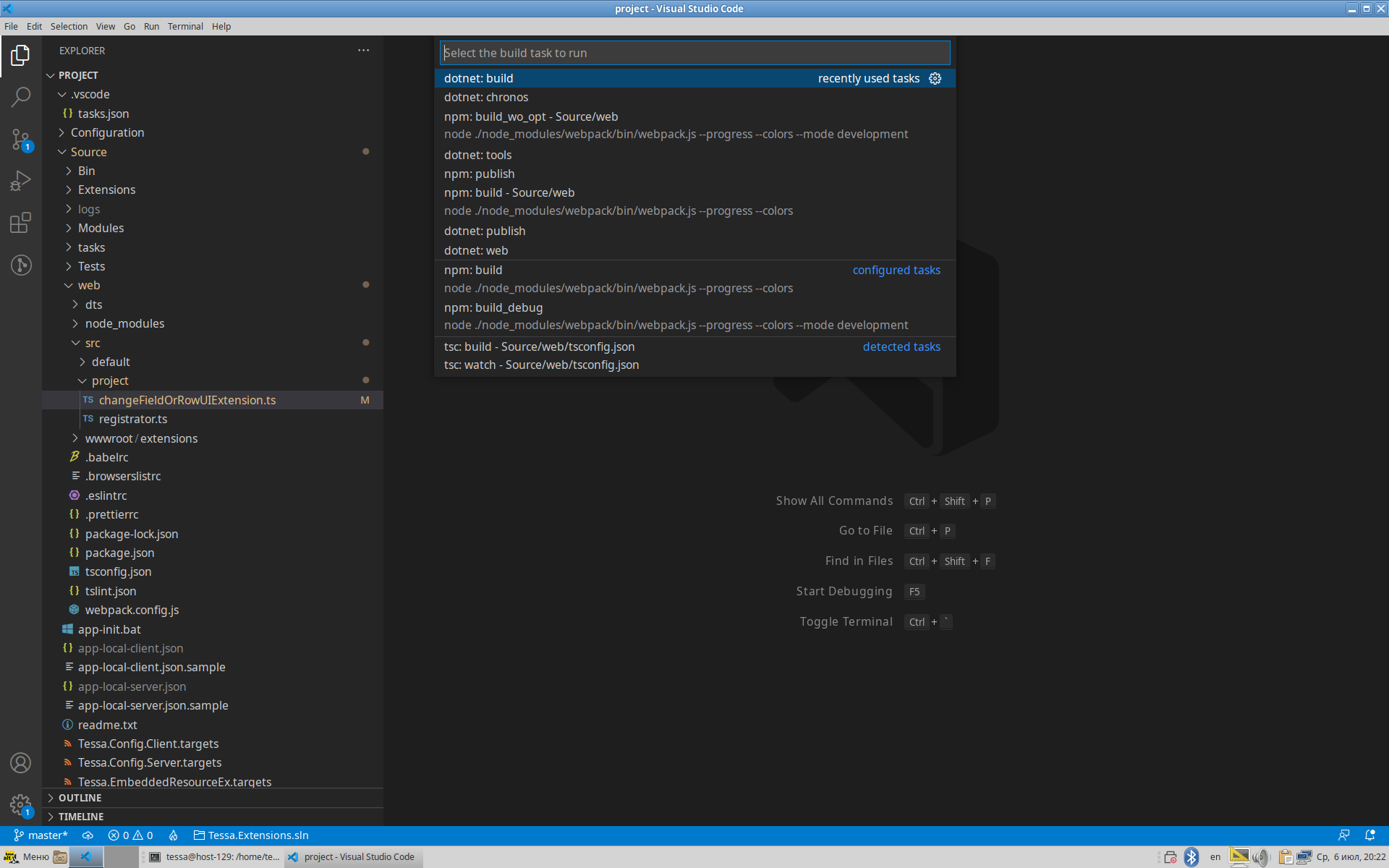 dotnet: build- сборка (компиляция) всех проектов .NET.dotnet: publish- обновление собранных библиотек для работающих веб-сервиса и сервиса Chronos, а также для утилиты tadmin. Для перезапуска сервисов потребуется ввести пароль текущего пользователя в командеsudo.npm: build- сборка расширений web-клиента.npm: publish- обновление расширений web-клиента в папке работающего веб-сервиса.