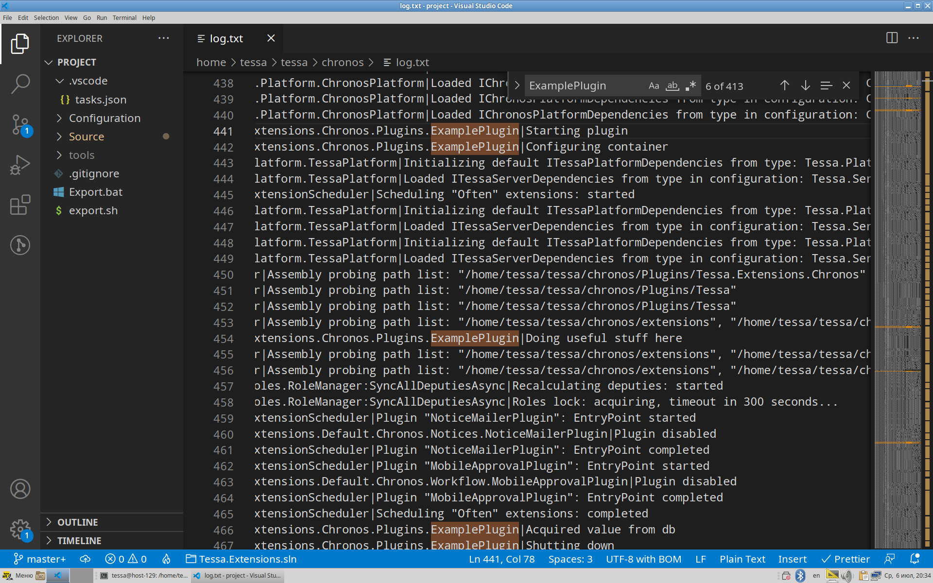 ~/tessa/chronos/log.txt, в нём будут записи отExamplePlugin(найдите их поиском по файлу).Это означает, что плагин запущен и работает.