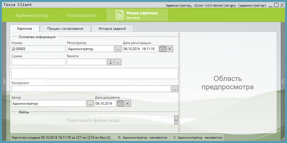 На рисунке изображена карточка договора, в которой зарезервирован номер “Д-00003”, указан регистратор как текущий пользователь “Администратор” и заполнена дата регистрации, поля “Автор” и “Дата документа”.