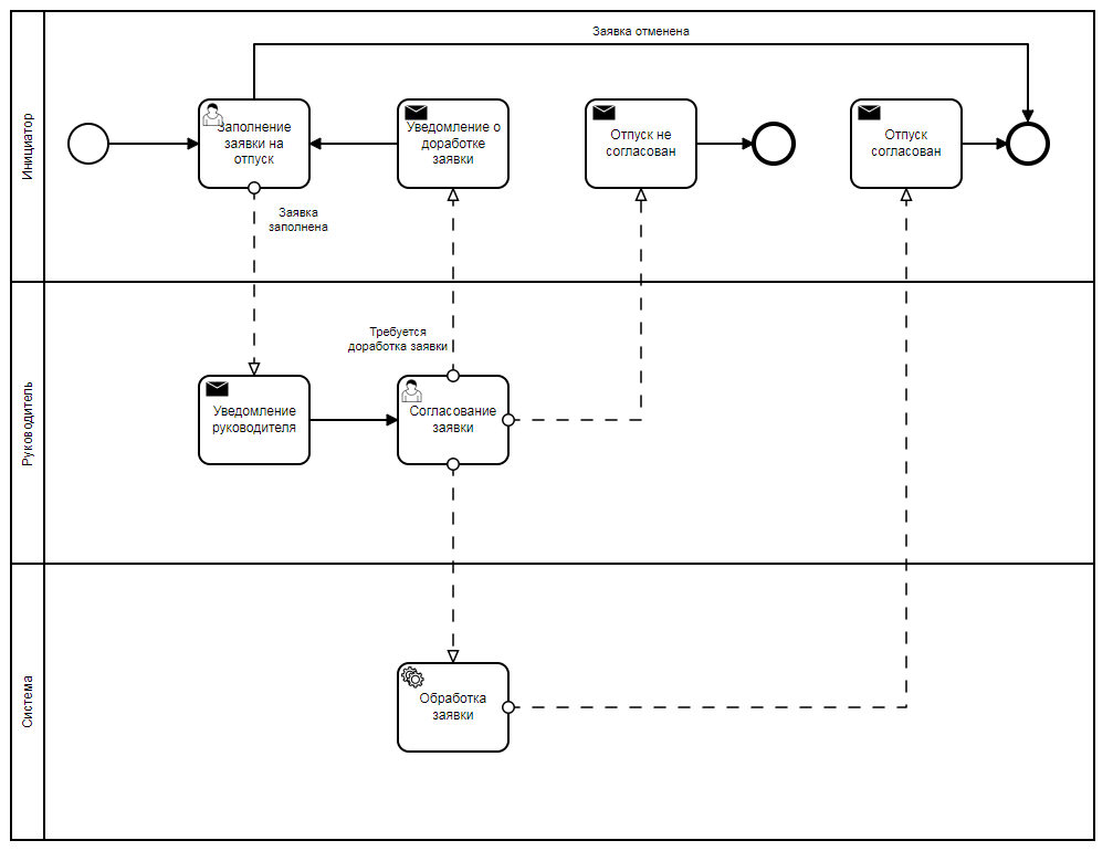 Рассмотрим абстрактный процесс согласования заявки на отпуск. В нотации BPMN он мог бы выглядеть примерно следующим образом: