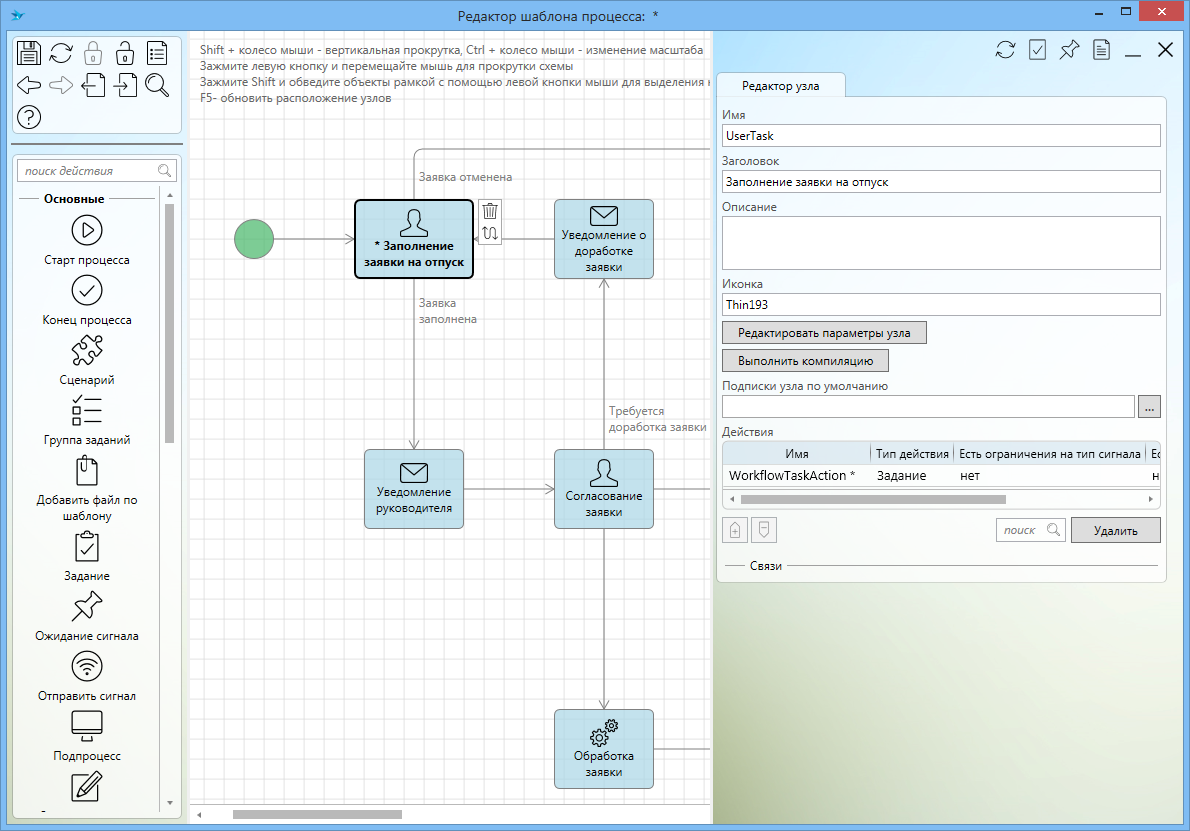 Далее рассмотрим узел Заполнение заявки на отпуск. В различных ситуациях данный узел может содержать различный набор действий, в зависимости от требований (в нем может меняться состояние заявки, выполняться какие-нибудь дополнительные скрипты и т.д.). В базовом примере предположим, что данный этап - это некоторое задание с вариантами завершения “Отправить на согласование” и “Отменить”. По умолчанию в каждом узле типа Действие (Activity) из BPMN добавляется одно действие с типом Сценарий. С помощью конструктора добавляем в данный узел действие с типом Задание и удаляем изначальное действие Сценарий.