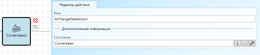 Следующим этапом добавим действие Смена состояния в процесс. Данное действие можно добавить непосредственно в узлы Согласование и Доработка при смене состояния при отправке задания, не связь между вторым согласованием и узлом Конец процесса, а также между узлами Доработка и Конец процесса.