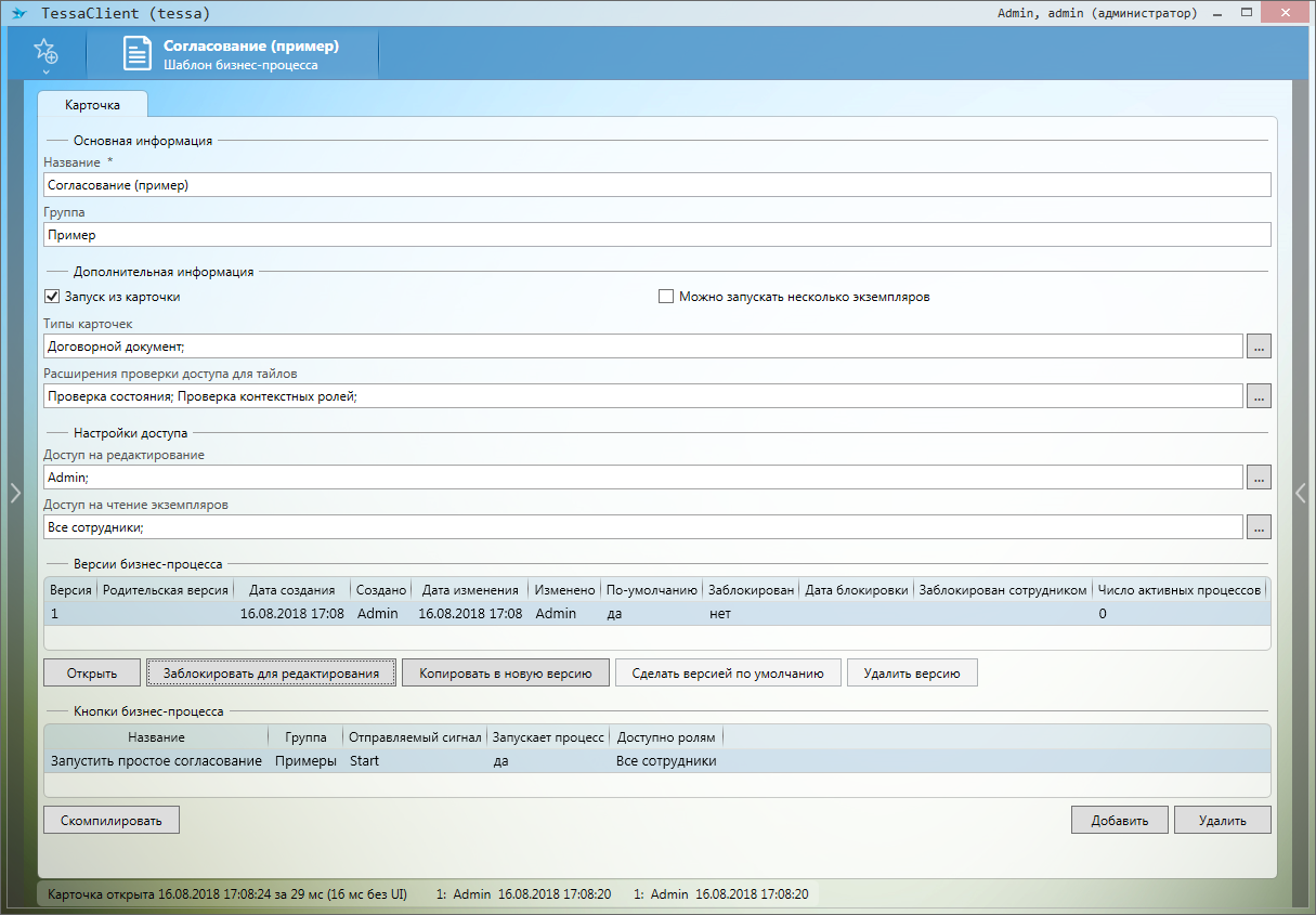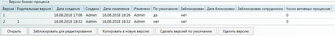 Шаблоны бизнес-процессов поддерживают версионность. Это позволяет изменять процесс, но при этом активные процессы продолжат функционировать без изменений. Версию процесса также можно удалить, но только при условии, что для нее нет активных экземпляров процесса.