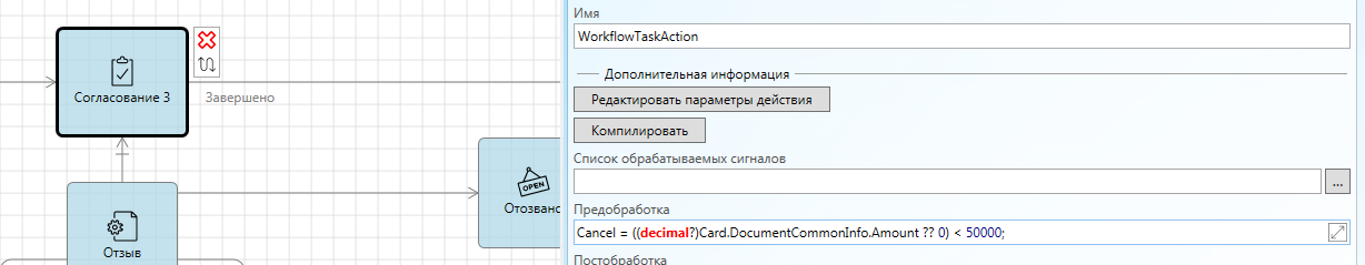 Теперь доработаем сам процесс. Добавим новый узел Отзыв с действием Управление заданием, из которого мы будем отправлять сигнал с отзывом задания в узлы согласования. В настройки узла укажем в поле Подписки узла по умолчанию тип сигнала Revoke. В само действие мы настроим так, чтобы оно завершало задание с вариантом Отозвано.