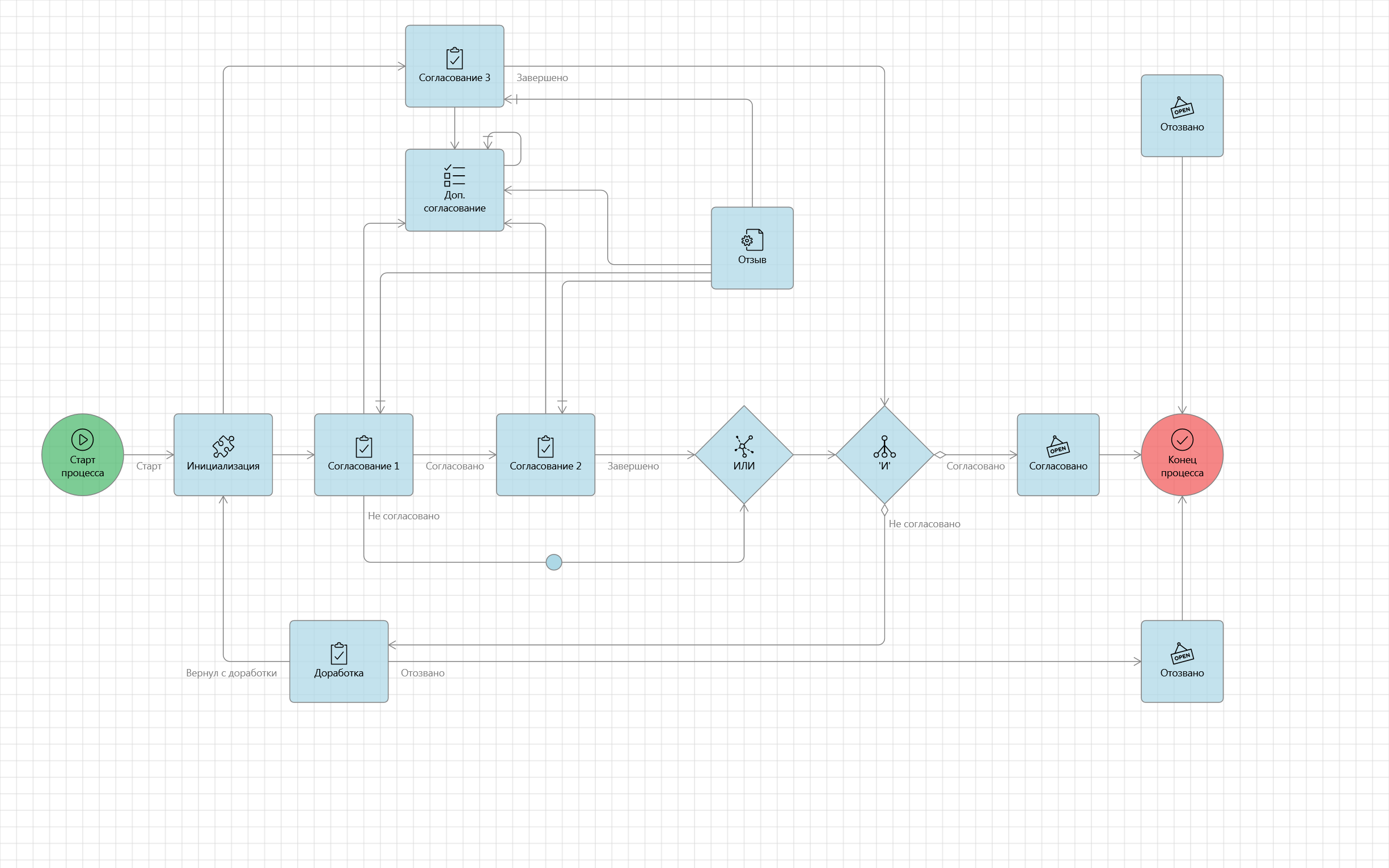 В итоге мы получили процесс с двумя последовательными согласованиями, сменой состояний, отправкой уведомления и отзывом согласования.
