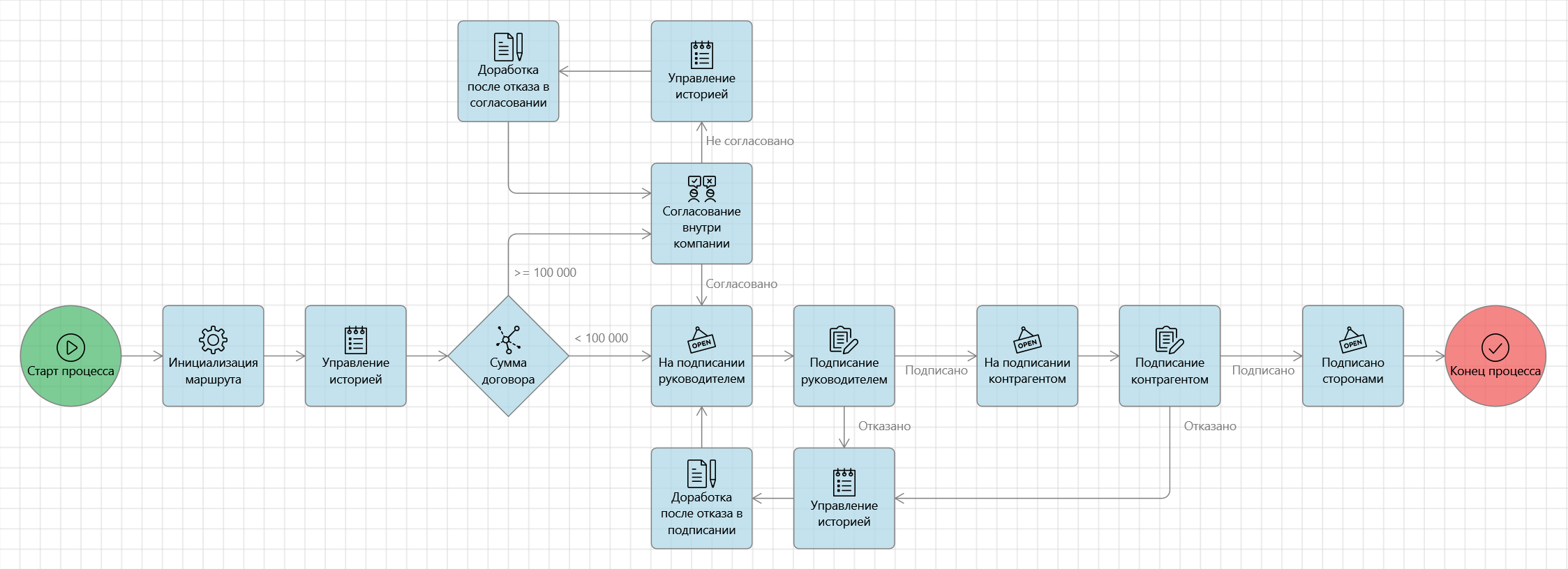 Реализуемый в данном примере процесс можно настроить более простым способом, используя действия из группы “Маршруты”. Пример их использования см. в разделе Примеры процессов с применением действий из группы “Маршруты”.