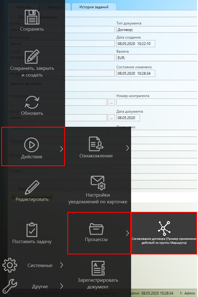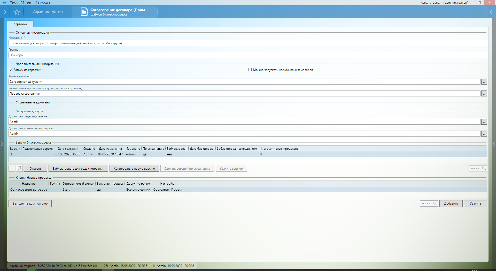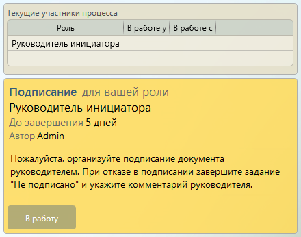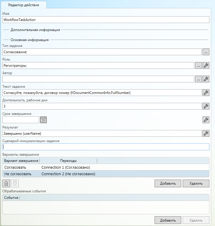Это пример поэтапного создания процесса со своими настройками, где используется стандартное действие “Задание”. Однако для заданий согласования и доработки удобно использовать соответствующие действия из группы “Маршруты”, т.к. в них уже заложено много функциональности, например, запрос дополнительного согласования, делегирование и т.п. Примеры с использованием действий группы “Маршруты” описаны в следующем разделе.