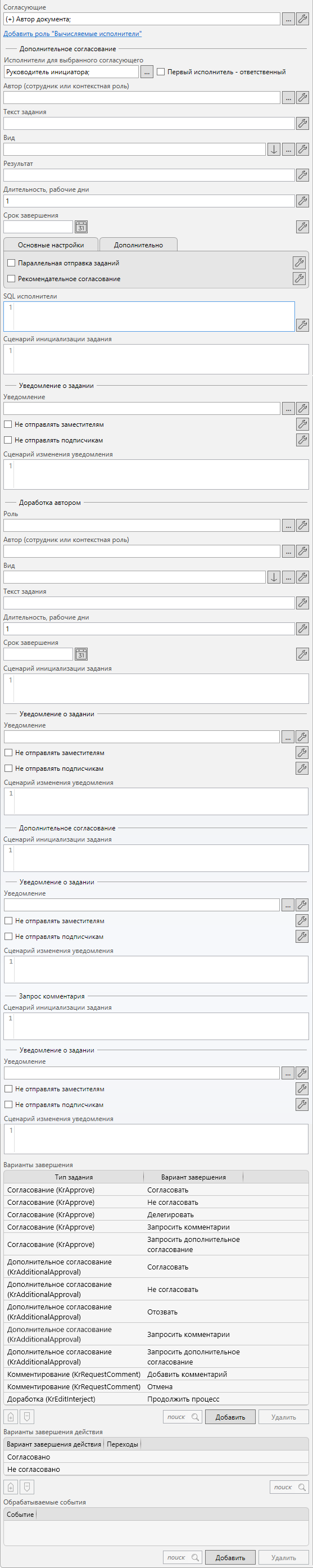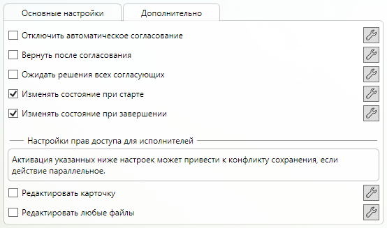 • Отключить автоматическое согласование (значение типа bool, может быть привязано к параметрам процесса) - отключить для данного действия автоматическое завершение заданий согласования (см. Автоматическое согласование).