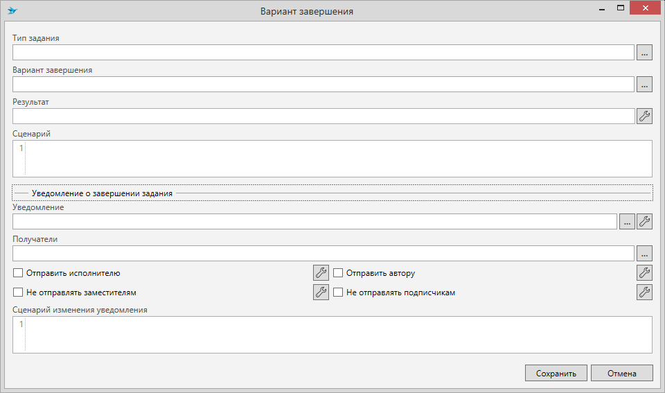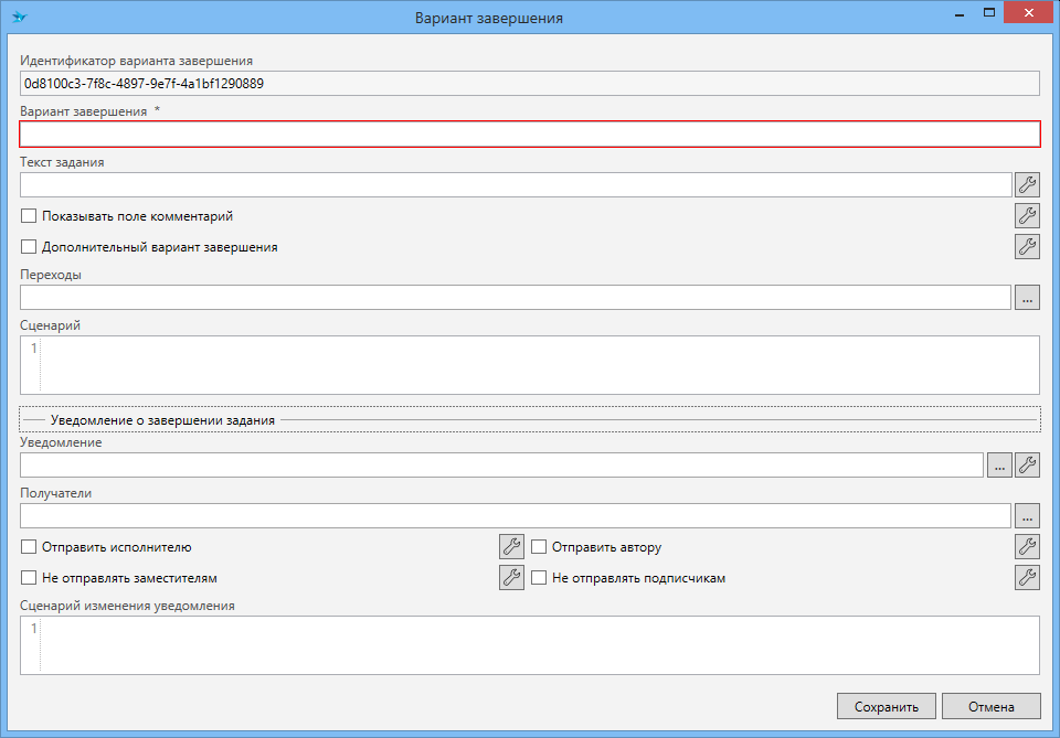 • Уведомление (значение из справочника уведомлений, может быть привязано к параметрам процесса) - карточка уведомления, по которой должна производиться отправка уведомления при завершении задания с указанным вариантом завершения.