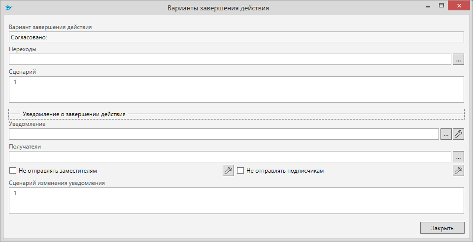 • Уведомление (значение из справочника уведомлений, может быть привязано к параметрам процесса) - карточка уведомления, по которой должна производиться отправка уведомления при завершении действия с указанным вариантом завершения.