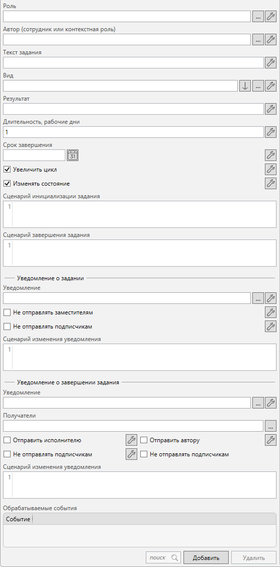 • Длительность, рабочие дни (значение типа double, может быть привязано к параметрам процесса) - определяет срок выполнения задания согласования в рабочих днях. Не может быть заполнено одновременно с полем Срок завершения.