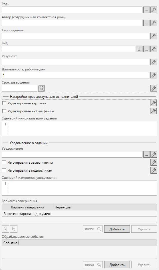 • Длительность, рабочие дни (значение типа double, может быть привязано к параметрам процесса) - определяет срок выполнения задания доработки автором в рабочих днях. Не может быть заполнено одновременно с полем Срок завершения.